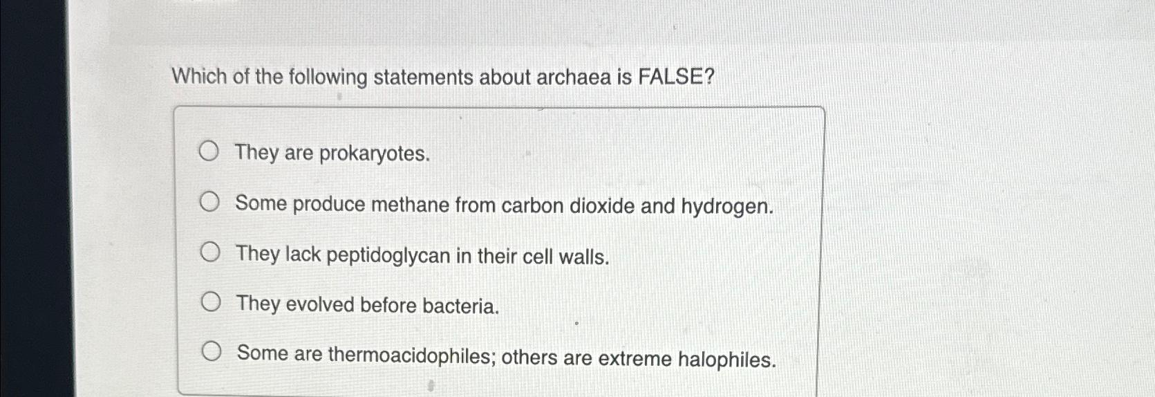 SOLVED Which of the following characteristics were present in the Which Of The Following Is Not True About Archaea Prokaryotic microorganisms known as archaea can survive in harsh conditions. How does archaeal flagella differ from bacterial. Archaea do not cause half of all human diseases. A) archaea and bacteria have different membrane lipids. which of the following statements is not true concerning bacteria and archaea? What are cannulae and hami? how do the pili of archaea differ. Which Of The Following Is Not True About Archaea.